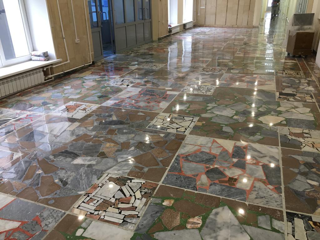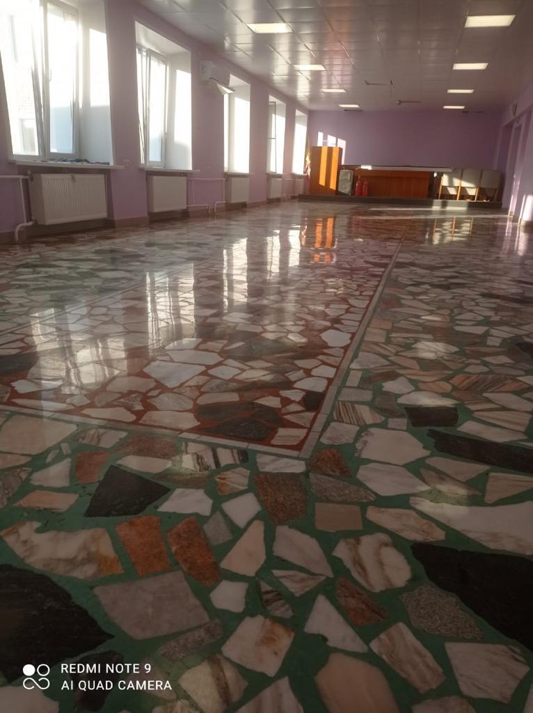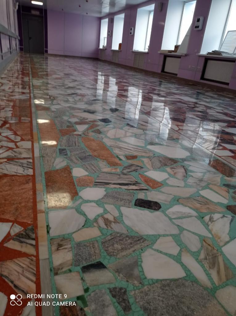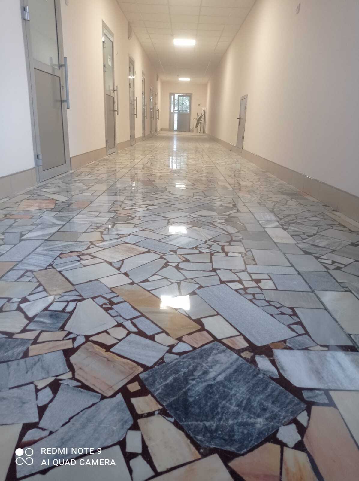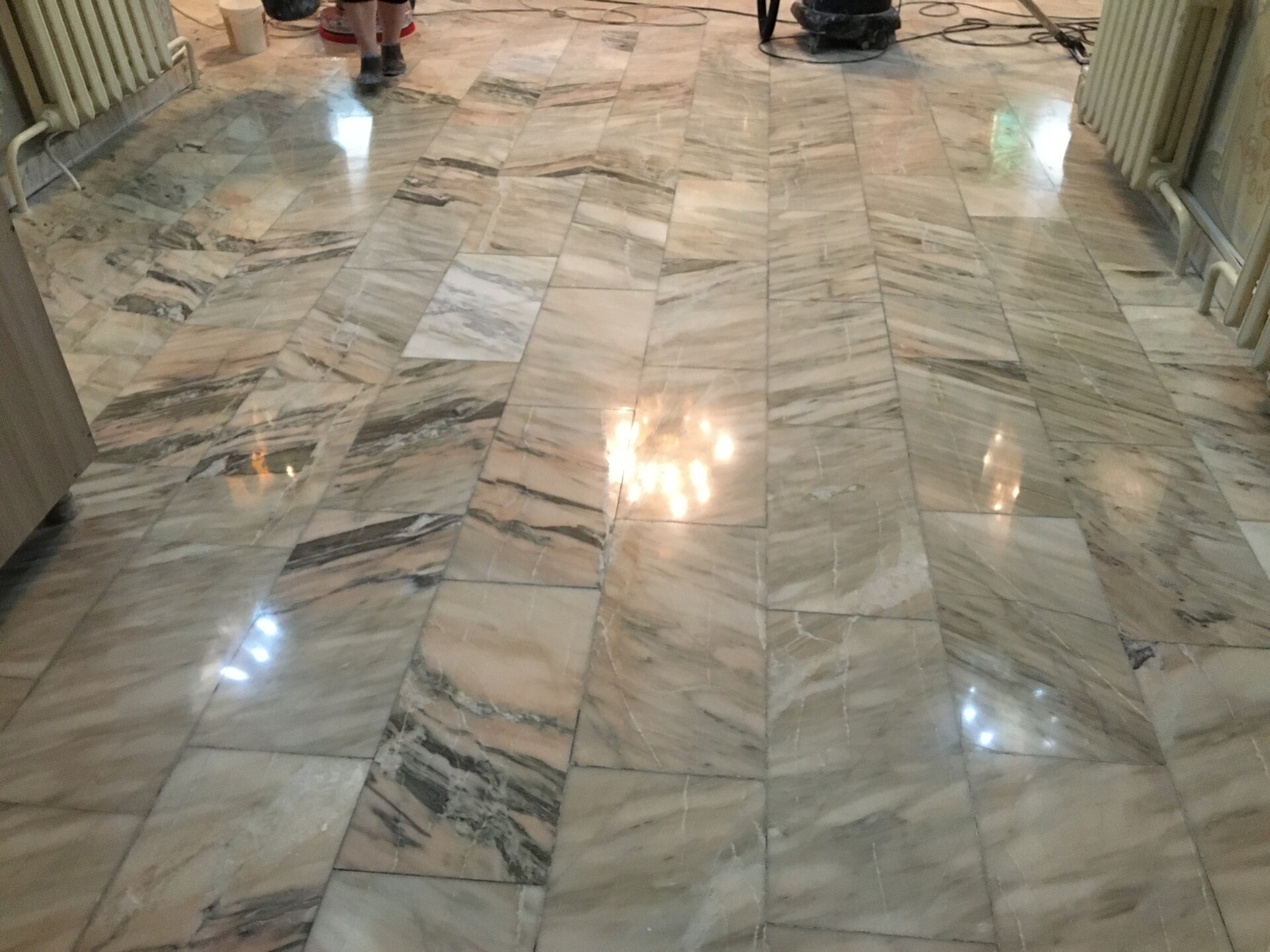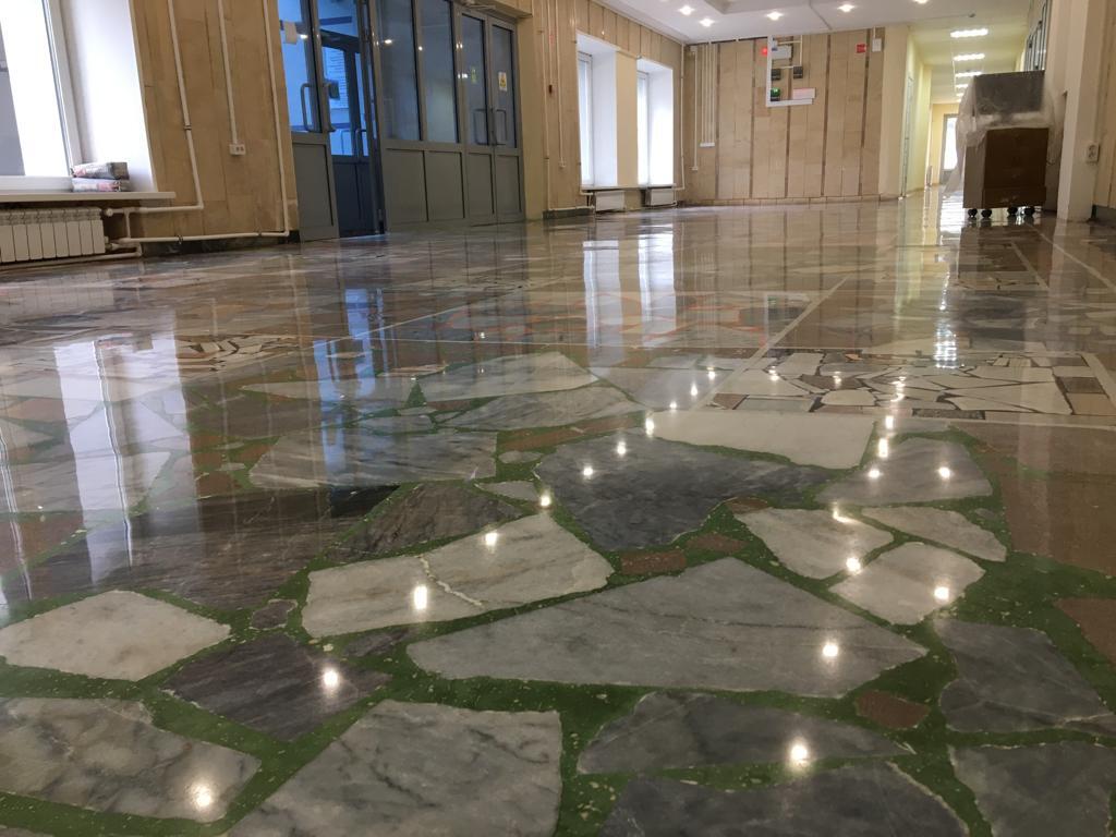 Шлифовка – это удаление глубоких царапин, путем снятия1-3 мм поверхностного слоя камня. В результате получают ровную и визуально гладкую поверхность без блеска (матовую).Для выполнения шлифовки пользуются шлифовальными машинами. Бригады, профессионально занимающиеся реставрацией, для шлифовки используют роторные шлифовальные машины. Шлифовка и последующая полировка выполняется по мокрой поверхности. Перед шлифовкой пол обильно смачивают водой, чтобы происходило охлаждение. Если пол достаточно старый и есть повреждения в районе швов, то в процессе шлифовки выполняют их реставрацию. Что это значит? После первичной шлифовки расчищают швы или расшивают при помощи болгарки. Специальной шпаклевкой для камня(пигментированной под цвет покрытия)заполняют швы. После высыхания шпаклевки(1-2 дня) выполняют финишную шлифовку до полной зачистки шпаклевки. После шлифовки пол необходимо тщательно вымыть и только потом приступать к следующему шагу –полировке.