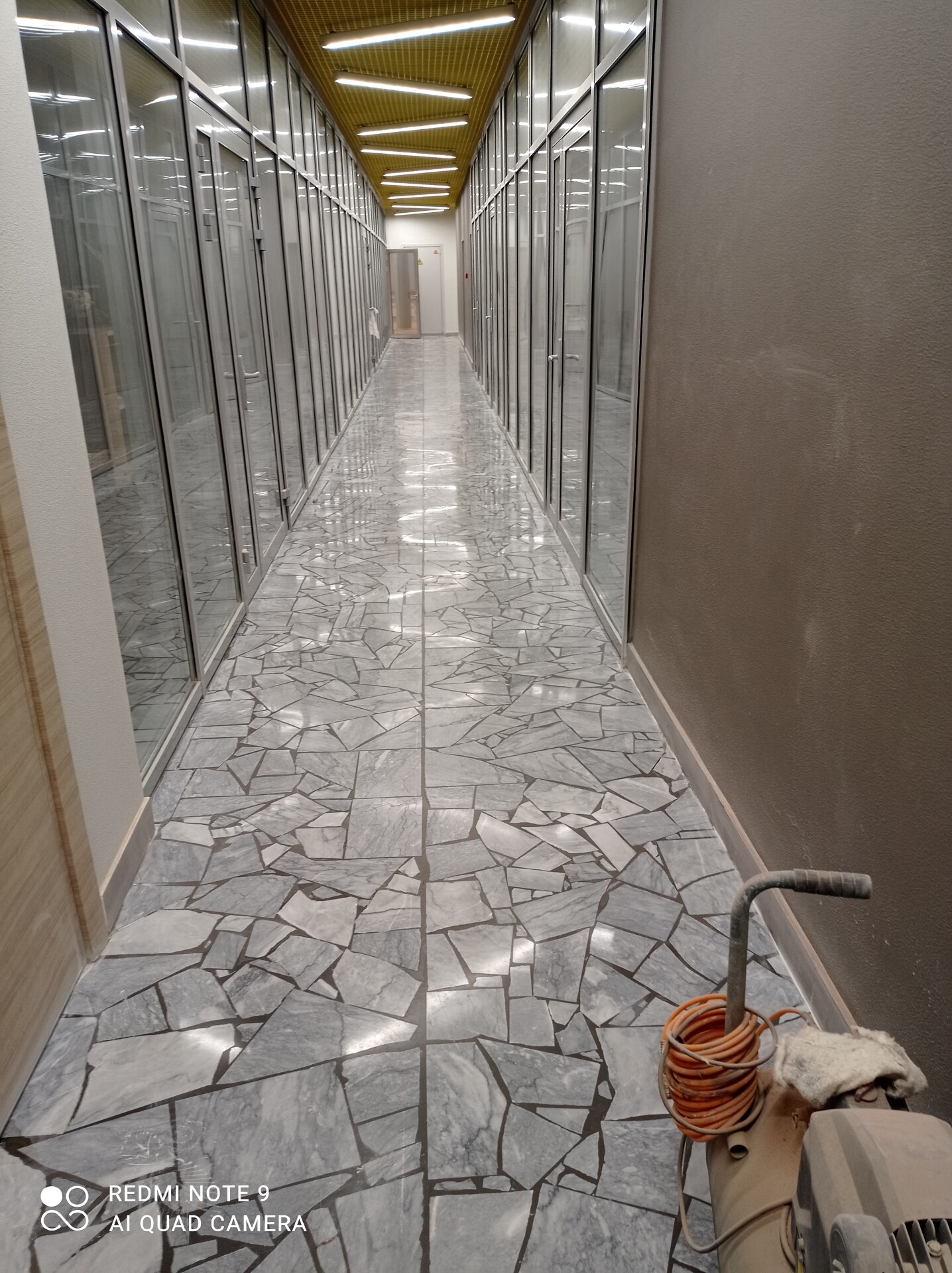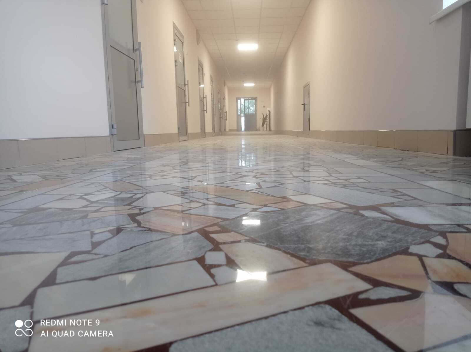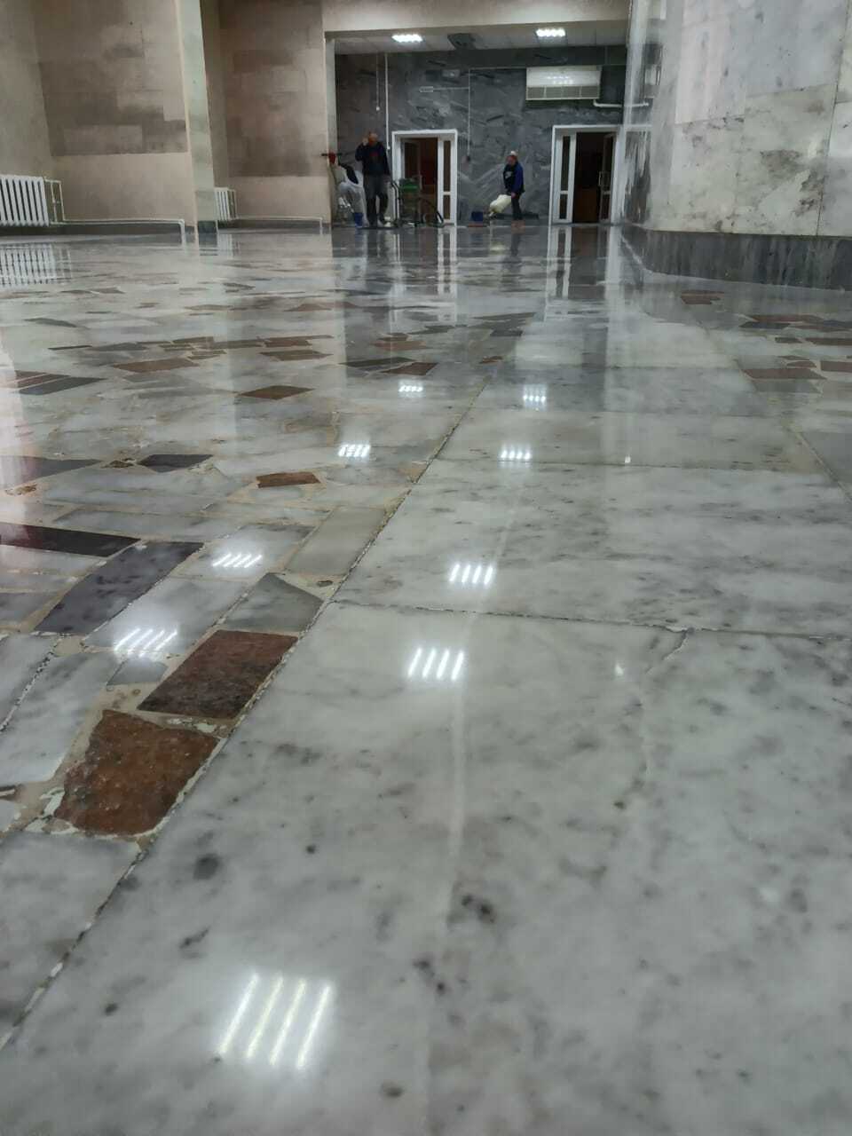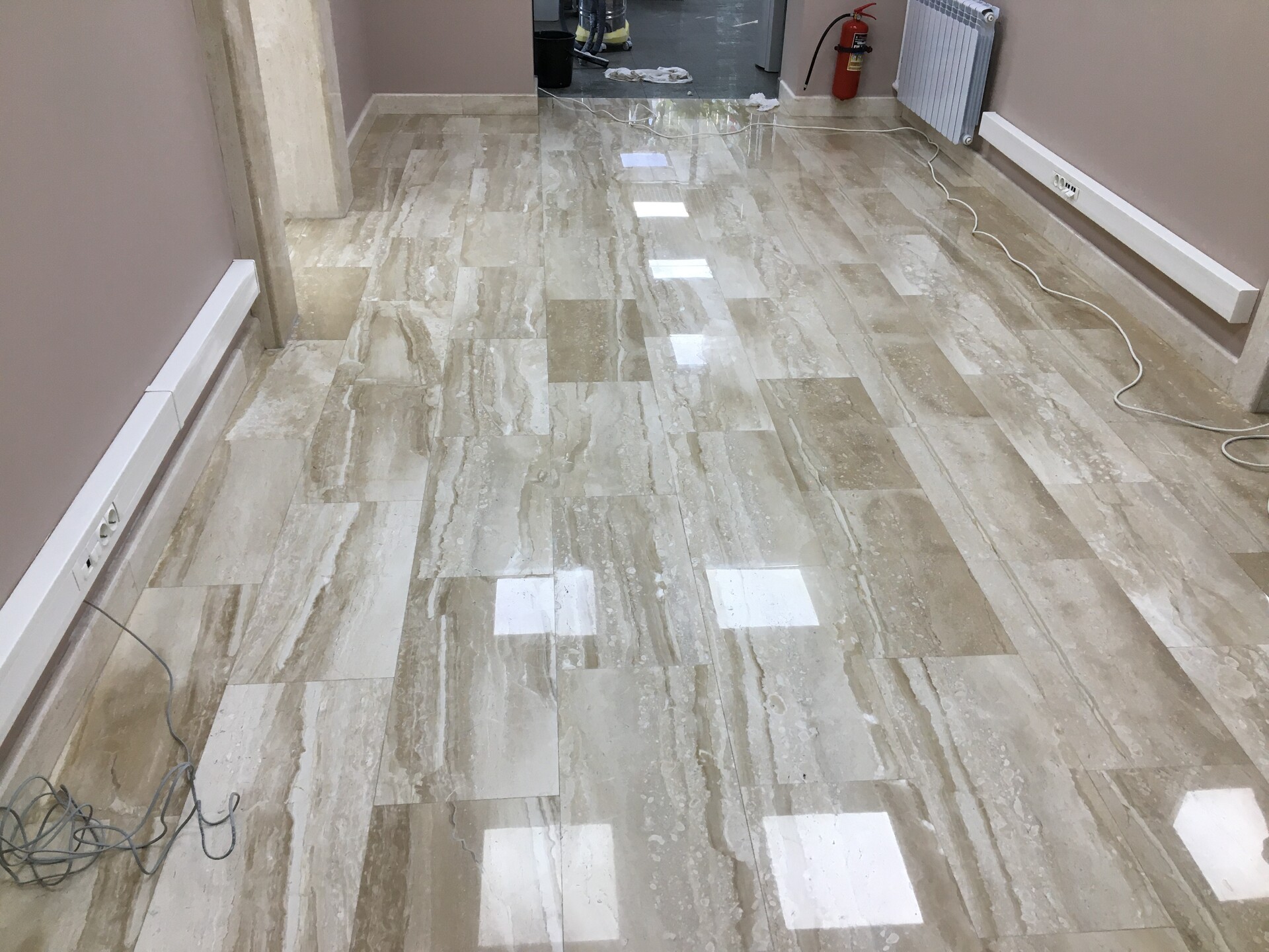 Шлифовка – это удаление глубоких царапин, путем снятия1-3 мм поверхностного слоя камня. В результате получают ровную и визуально гладкую поверхность без блеска (матовую).Для выполнения шлифовки пользуются шлифовальными машинами. Бригады, профессионально занимающиеся реставрацией, для шлифовки используют роторные шлифовальные машины. Шлифовка и последующая полировка выполняется по мокрой поверхности. Перед шлифовкой пол обильно смачивают водой, чтобы происходило охлаждение. Если пол достаточно старый и есть повреждения в районе швов, то в процессе шлифовки выполняют их реставрацию. Что это значит? После первичной шлифовки расчищают швы или расшивают при помощи болгарки. Специальной шпаклевкой для камня(пигментированной под цвет покрытия)заполняют швы. После высыхания шпаклевки(1-2 дня) выполняют финишную шлифовку до полной зачистки шпаклевки. После шлифовки пол необходимо тщательно вымыть и только потом приступать к следующему шагу –полировке.