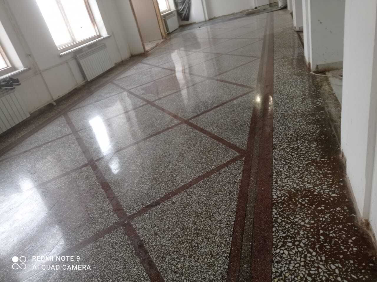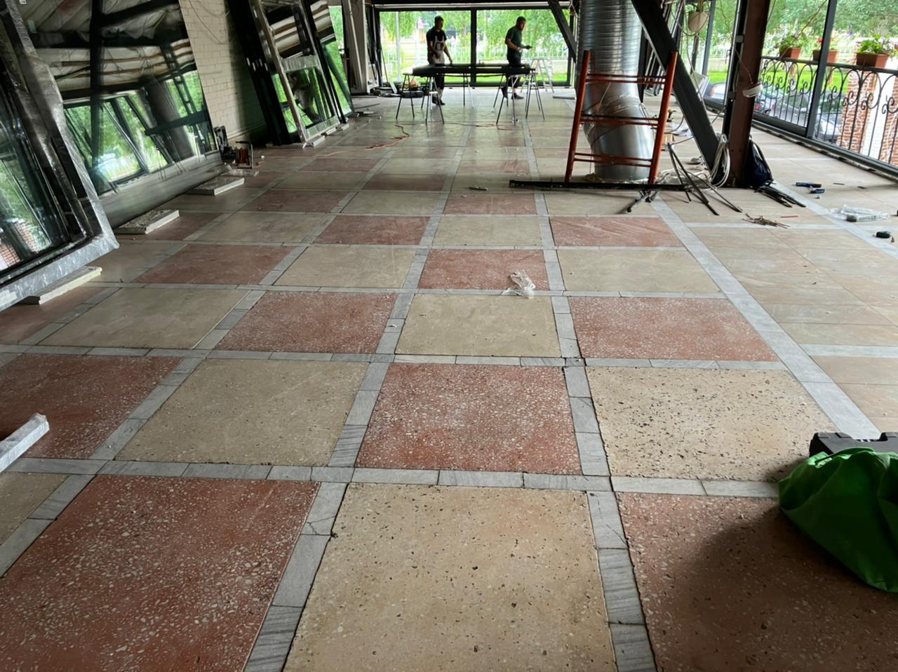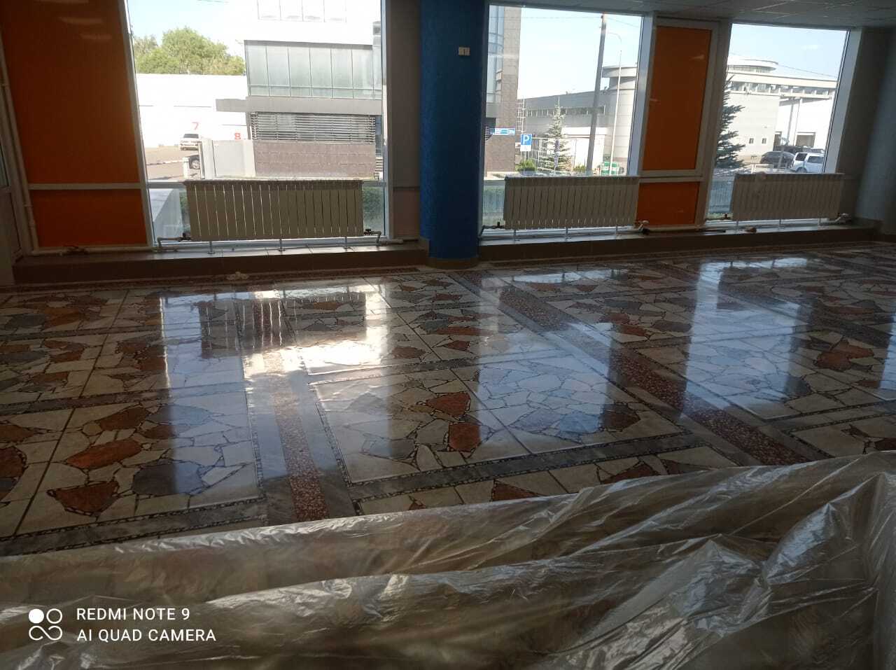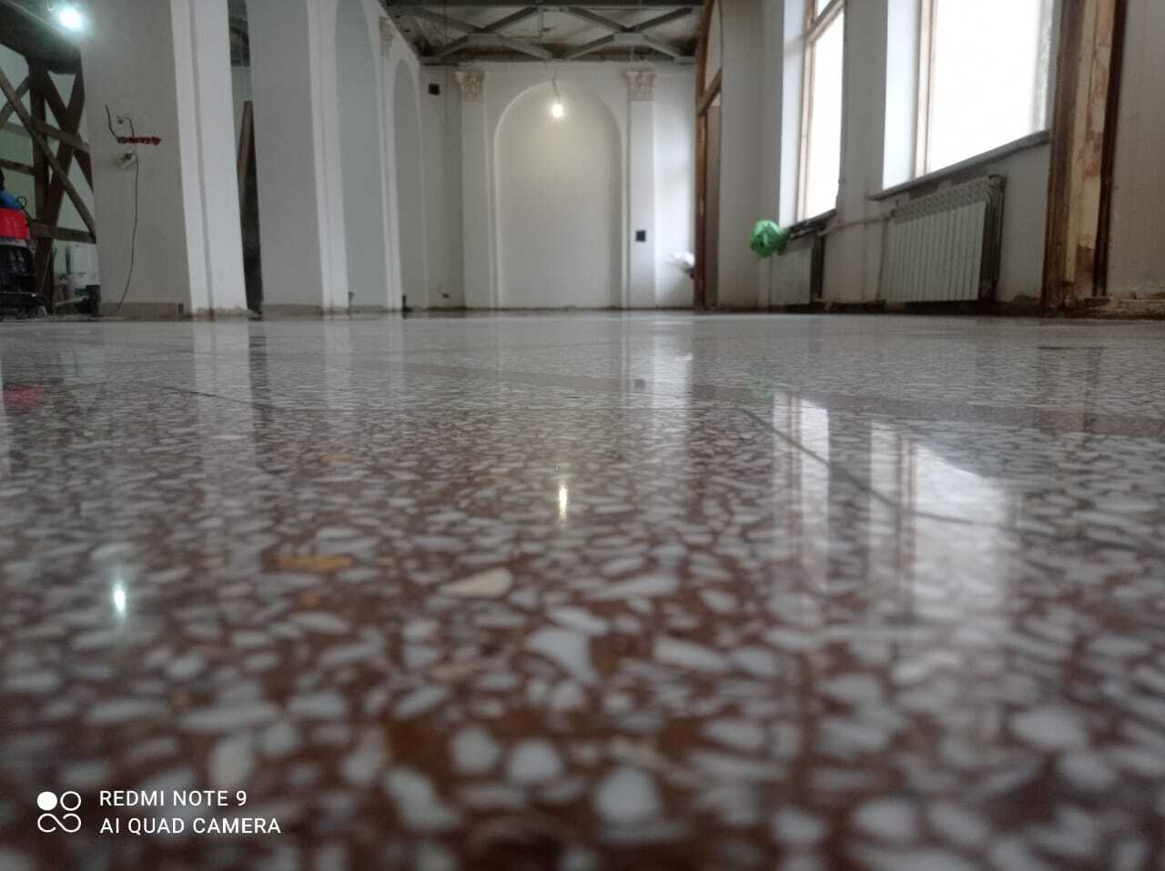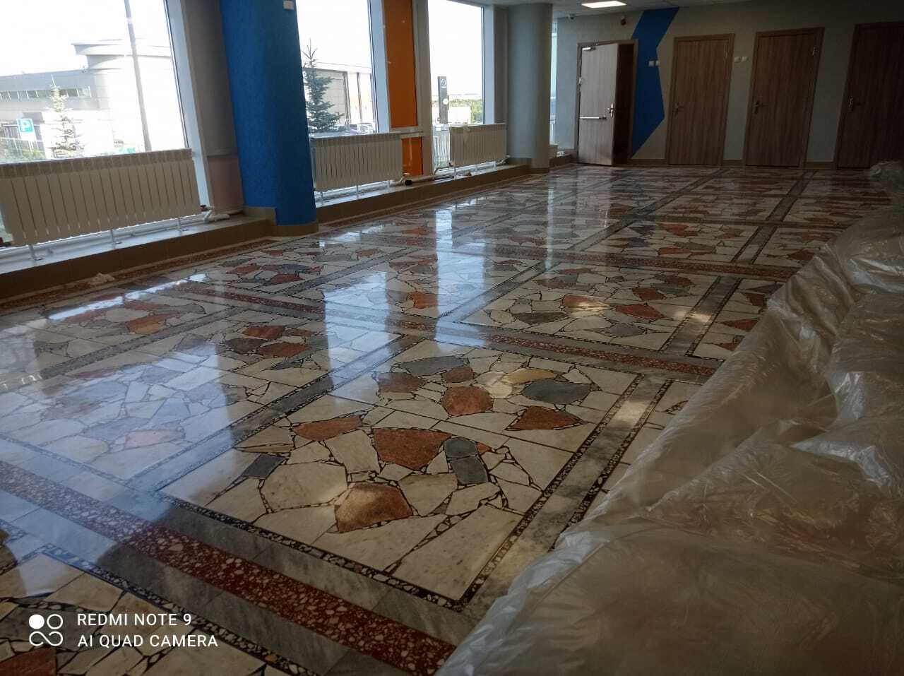 Шлифовка – это удаление глубоких царапин, путем снятия1-3 мм поверхностного слоя камня. В результате получают ровную и визуально гладкую поверхность без блеска (матовую).Для выполнения шлифовки пользуются шлифовальными машинами. Бригады, профессионально занимающиеся реставрацией, для шлифовки используют роторные шлифовальные машины. Шлифовка и последующая полировка выполняется по мокрой поверхности. Перед шлифовкой пол обильно смачивают водой, чтобы происходило охлаждение. Если пол достаточно старый и есть повреждения в районе швов, то в процессе шлифовки выполняют их реставрацию. Что это значит? После первичной шлифовки расчищают швы или расшивают при помощи болгарки. Специальной шпаклевкой для камня(пигментированной под цвет покрытия)заполняют швы. После высыхания шпаклевки(1-2 дня) выполняют финишную шлифовку до полной зачистки шпаклевки. После шлифовки пол необходимо тщательно вымыть и только потом приступать к следующему шагу –полировке.