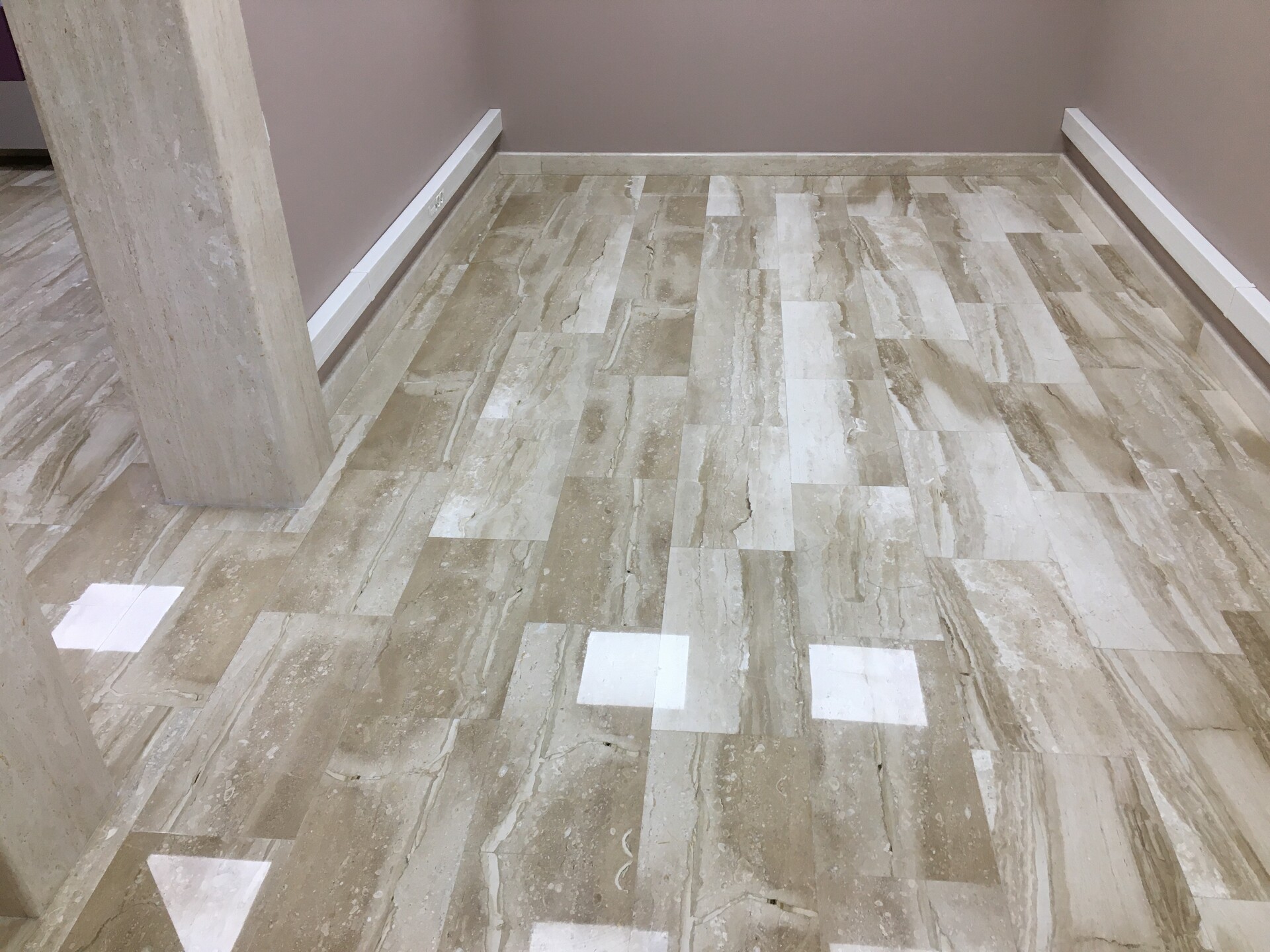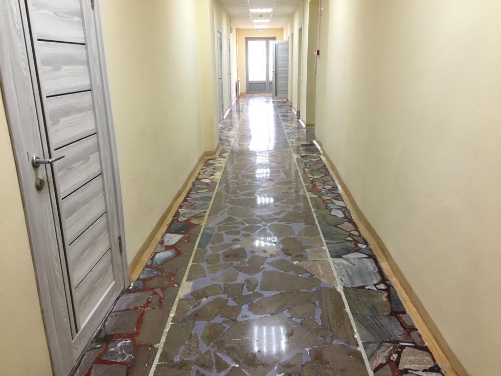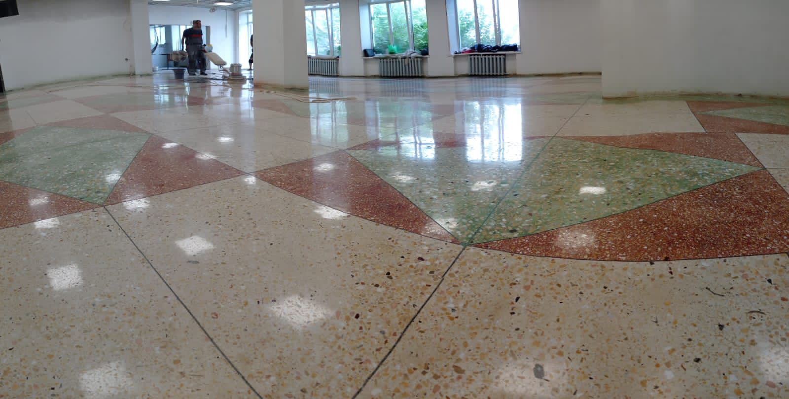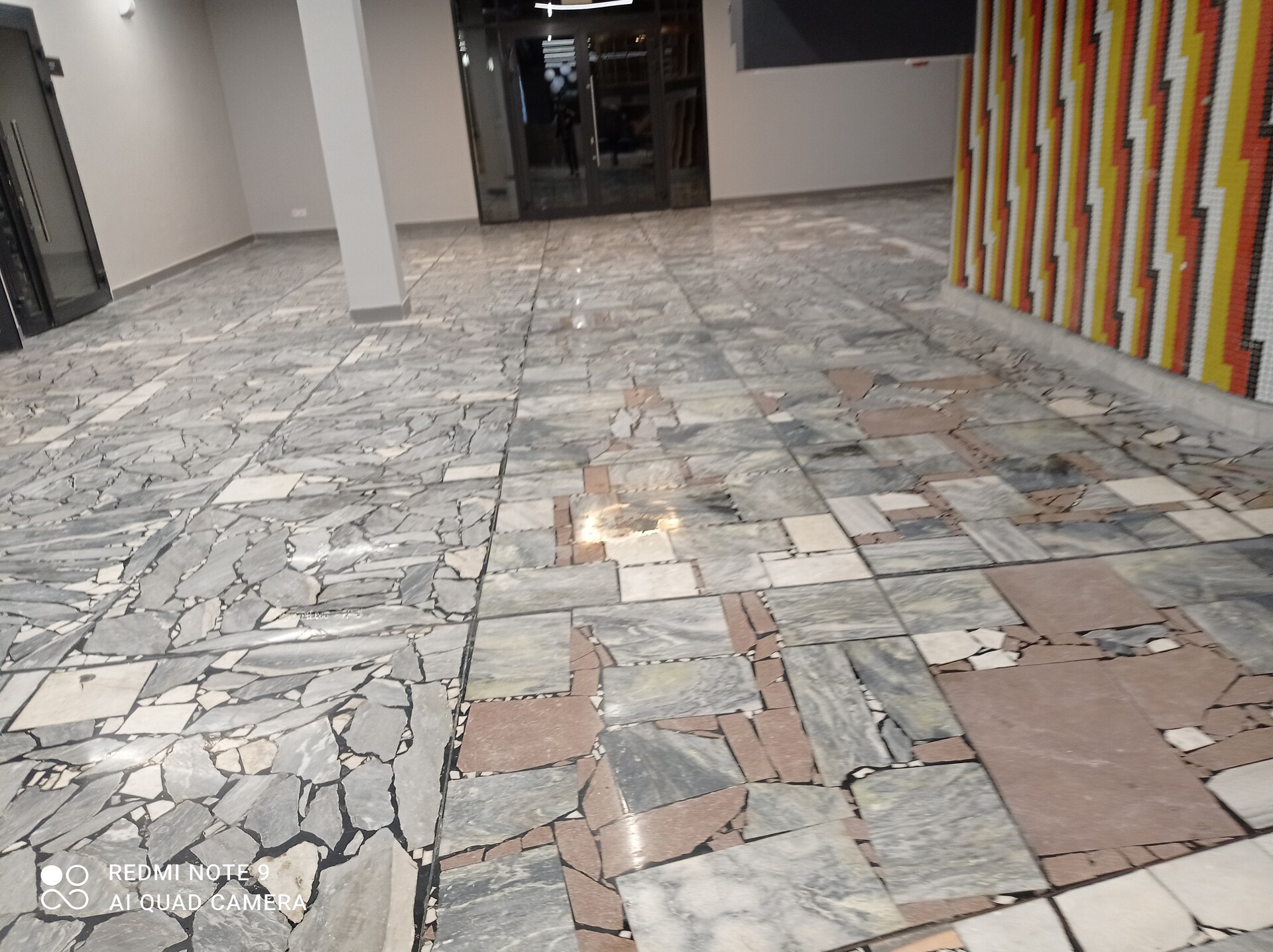 Шлифовка – это удаление глубоких царапин, путем снятия1-3 мм поверхностного слоя камня. В результате получают ровную и визуально гладкую поверхность без блеска (матовую).Для выполнения шлифовки пользуются шлифовальными машинами. Бригады, профессионально занимающиеся реставрацией, для шлифовки используют роторные шлифовальные машины. Шлифовка и последующая полировка выполняется по мокрой поверхности. Перед шлифовкой пол обильно смачивают водой, чтобы происходило охлаждение. Если пол достаточно старый и есть повреждения в районе швов, то в процессе шлифовки выполняют их реставрацию. Что это значит? После первичной шлифовки расчищают швы или расшивают при помощи болгарки. Специальной шпаклевкой для камня(пигментированной под цвет покрытия)заполняют швы. После высыхания шпаклевки(1-2 дня) выполняют финишную шлифовку до полной зачистки шпаклевки. После шлифовки пол необходимо тщательно вымыть и только потом приступать к следующему шагу –полировке.