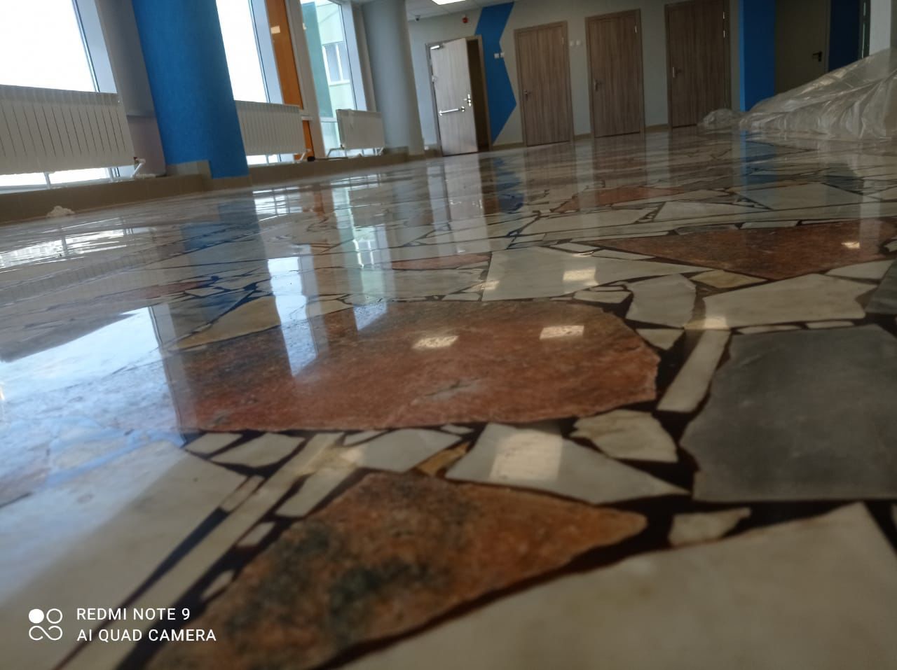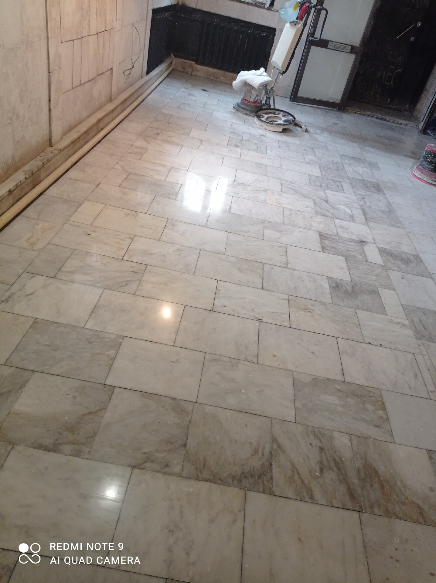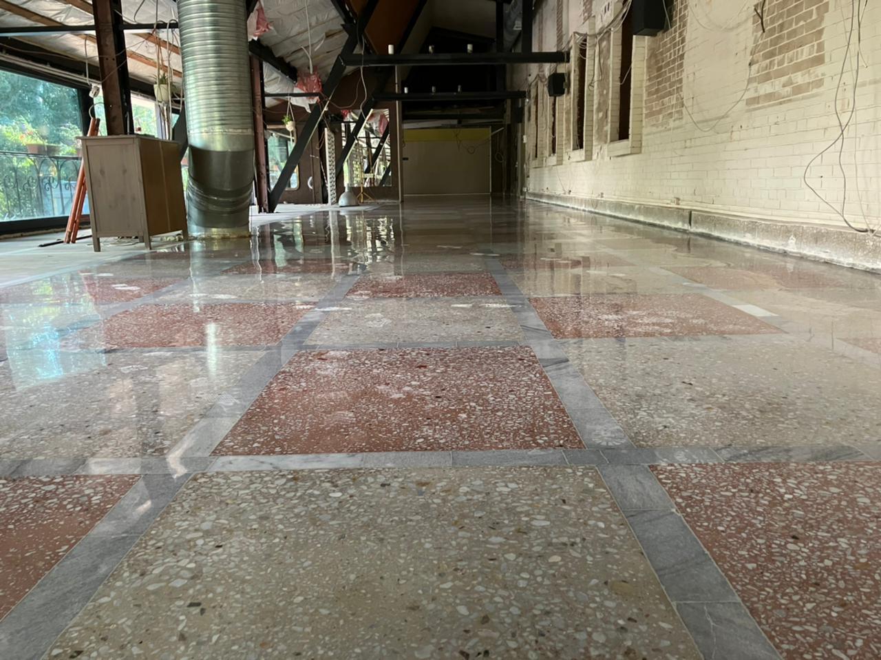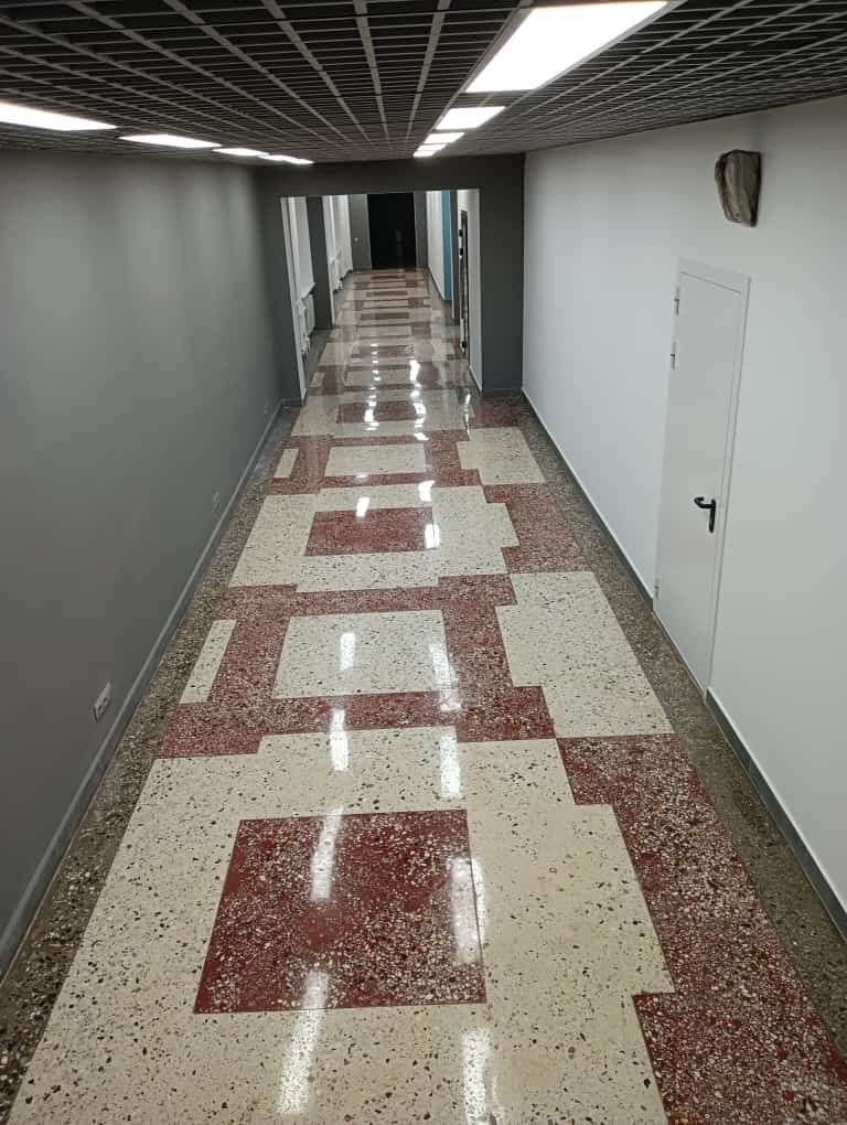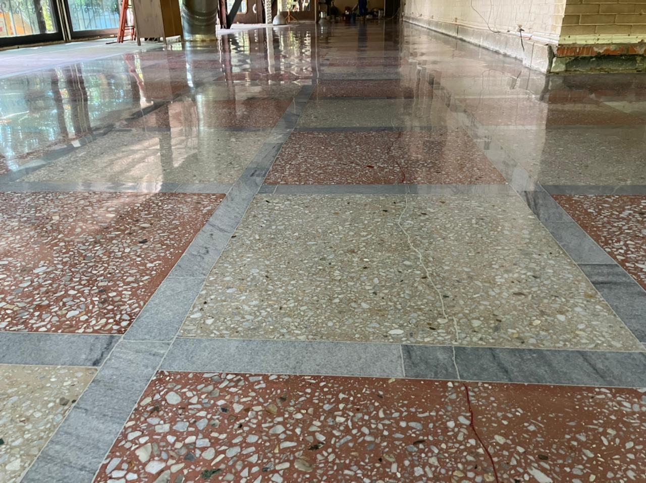 Шлифовка – это удаление глубоких царапин, путем снятия1-3 мм поверхностного слоя камня. В результате получают ровную и визуально гладкую поверхность без блеска (матовую).Для выполнения шлифовки пользуются шлифовальными машинами. Бригады, профессионально занимающиеся реставрацией, для шлифовки используют роторные шлифовальные машины. Шлифовка и последующая полировка выполняется по мокрой поверхности. Перед шлифовкой пол обильно смачивают водой, чтобы происходило охлаждение. Если пол достаточно старый и есть повреждения в районе швов, то в процессе шлифовки выполняют их реставрацию. Что это значит? После первичной шлифовки расчищают швы или расшивают при помощи болгарки. Специальной шпаклевкой для камня(пигментированной под цвет покрытия)заполняют швы. После высыхания шпаклевки(1-2 дня) выполняют финишную шлифовку до полной зачистки шпаклевки. После шлифовки пол необходимо тщательно вымыть и только потом приступать к следующему шагу –полировке.