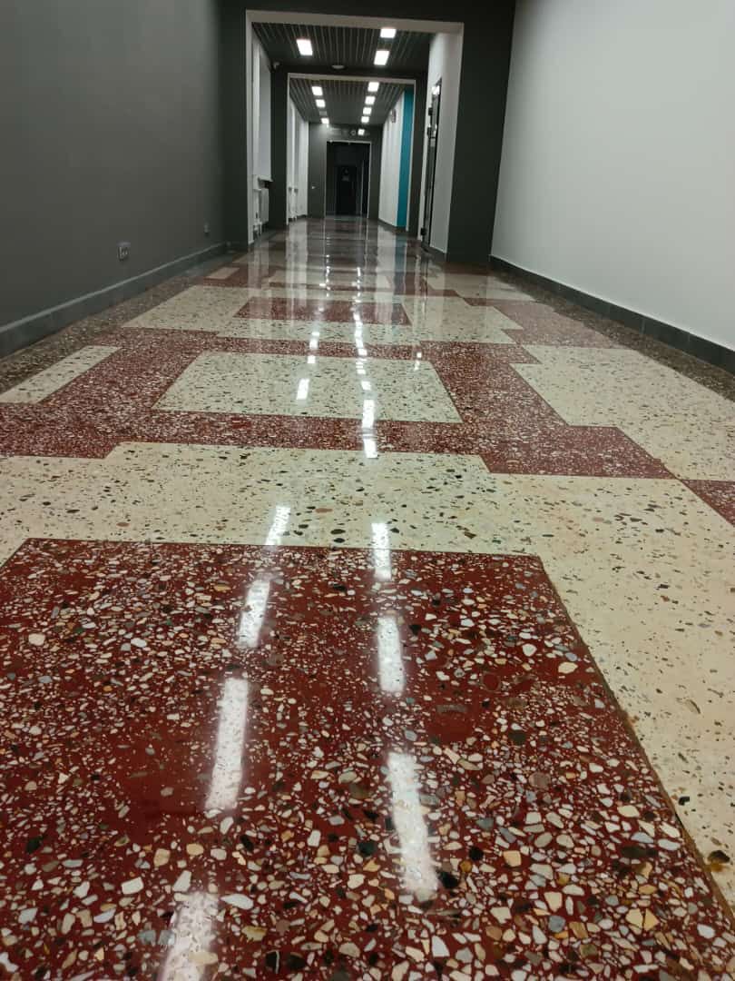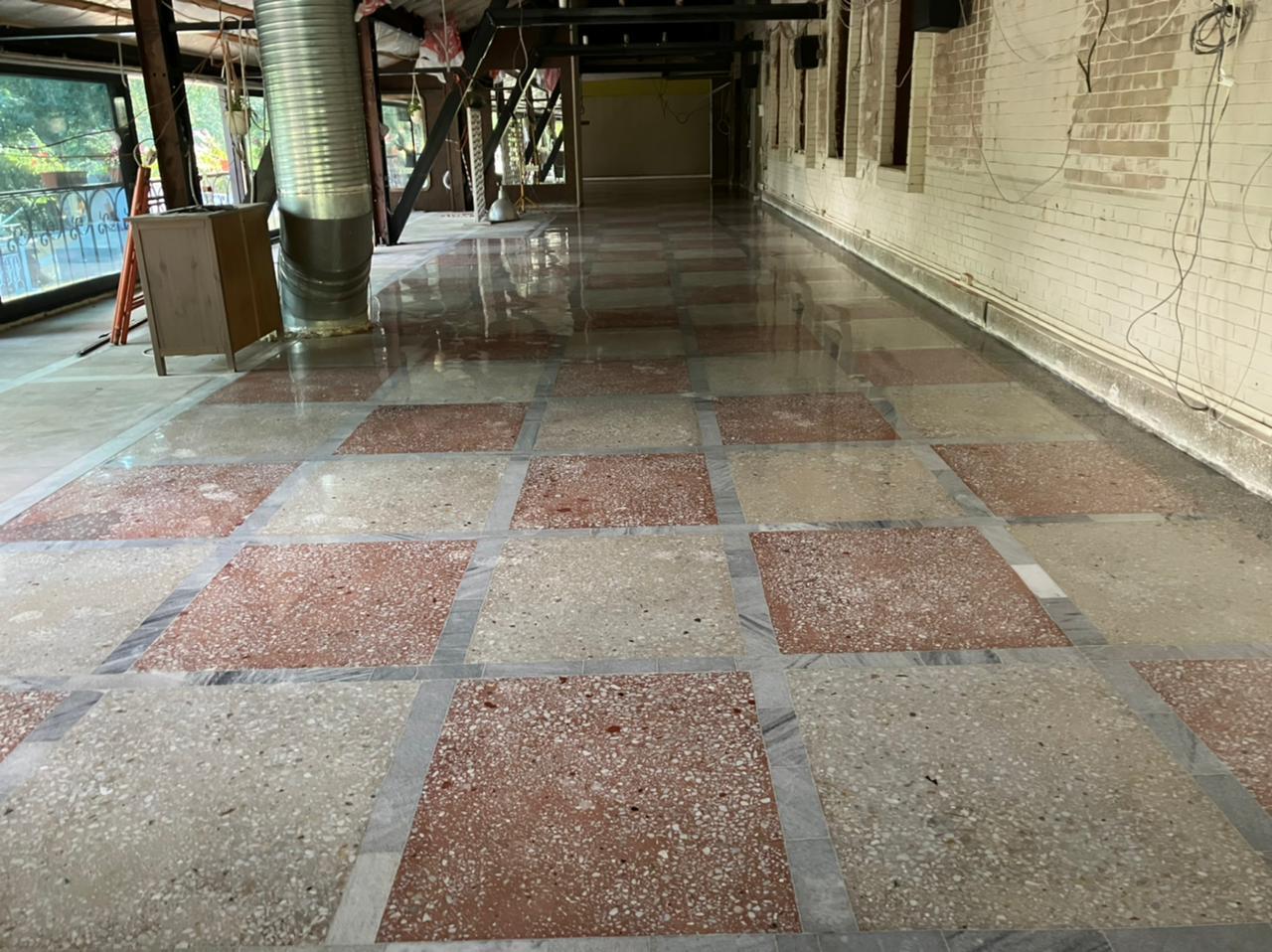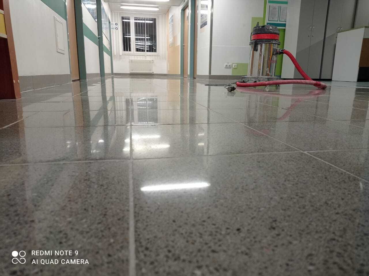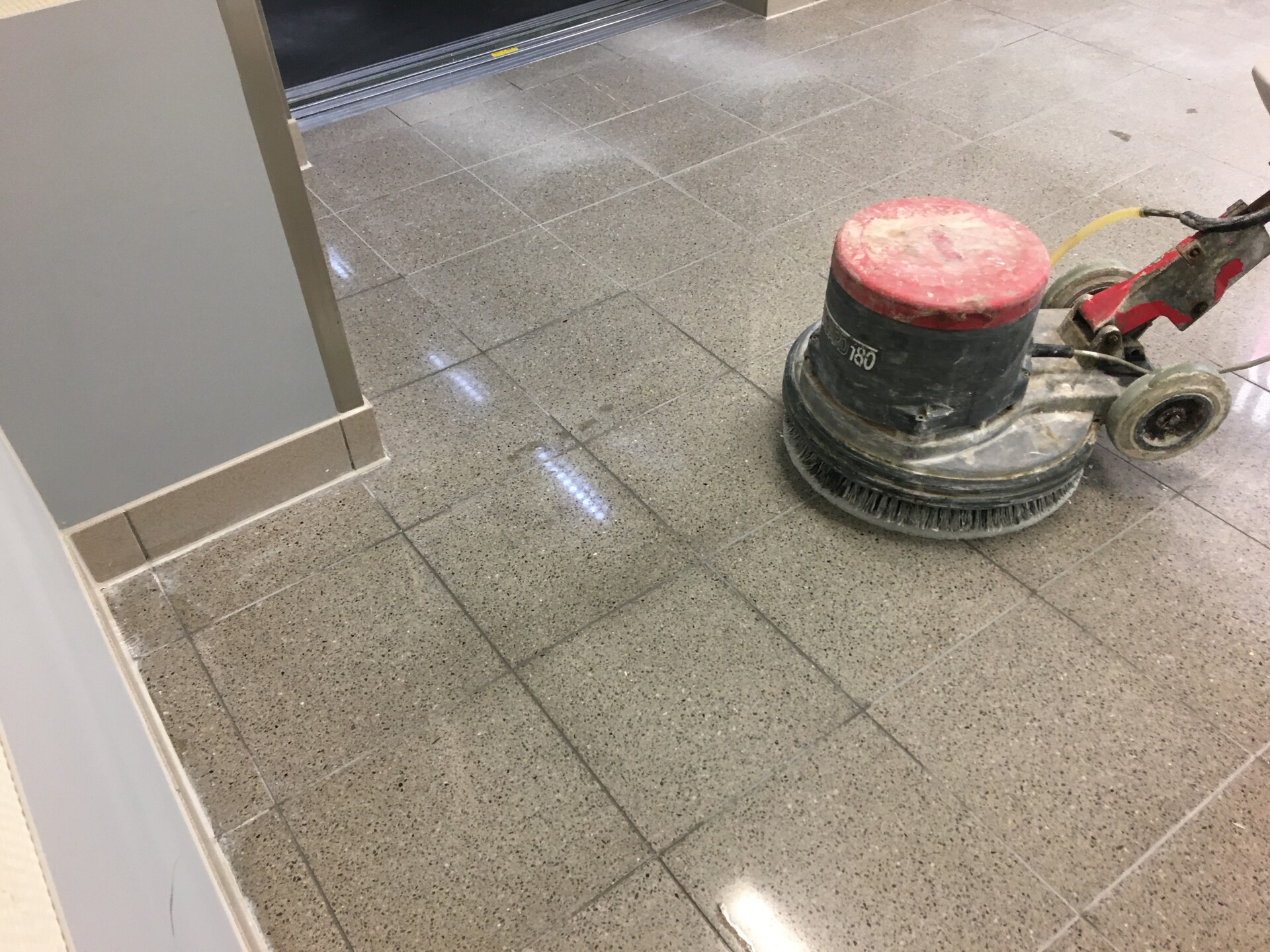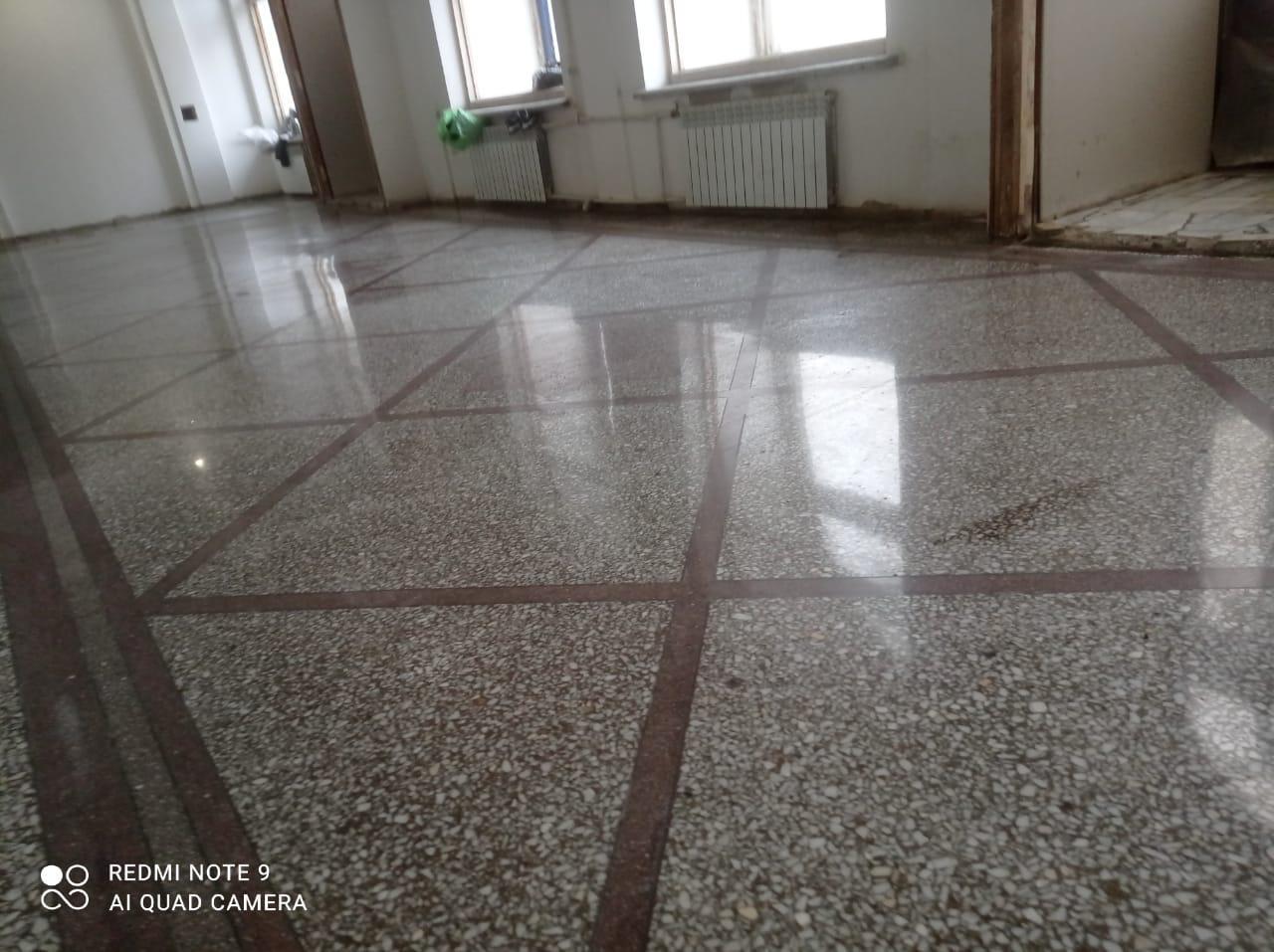 Шлифовка – это удаление глубоких царапин, путем снятия1-3 мм поверхностного слоя камня. В результате получают ровную и визуально гладкую поверхность без блеска (матовую).Для выполнения шлифовки пользуются шлифовальными машинами. Бригады, профессионально занимающиеся реставрацией, для шлифовки используют роторные шлифовальные машины. Шлифовка и последующая полировка выполняется по мокрой поверхности. Перед шлифовкой пол обильно смачивают водой, чтобы происходило охлаждение. Если пол достаточно старый и есть повреждения в районе швов, то в процессе шлифовки выполняют их реставрацию. Что это значит? После первичной шлифовки расчищают швы или расшивают при помощи болгарки. Специальной шпаклевкой для камня(пигментированной под цвет покрытия)заполняют швы. После высыхания шпаклевки(1-2 дня) выполняют финишную шлифовку до полной зачистки шпаклевки. После шлифовки пол необходимо тщательно вымыть и только потом приступать к следующему шагу –полировке.