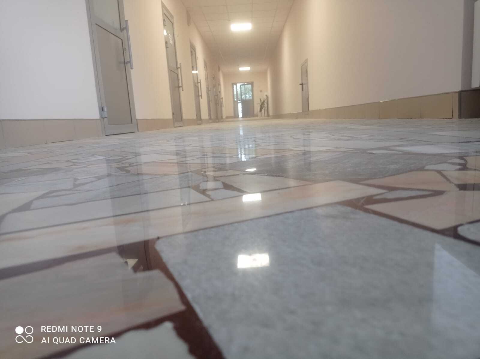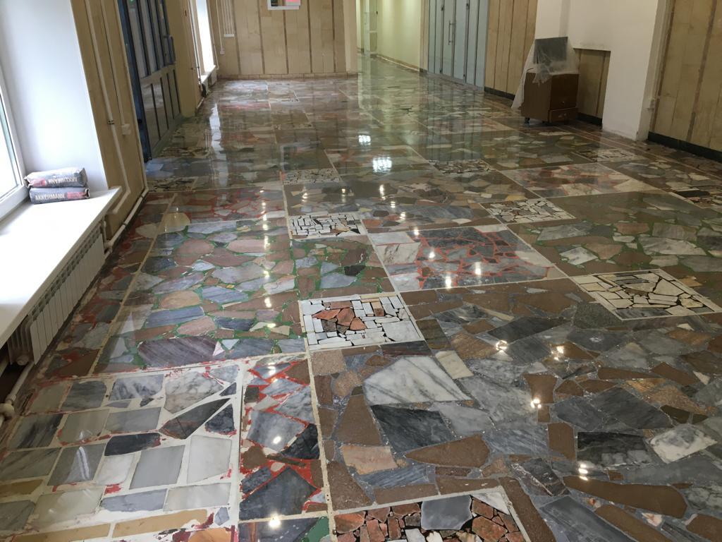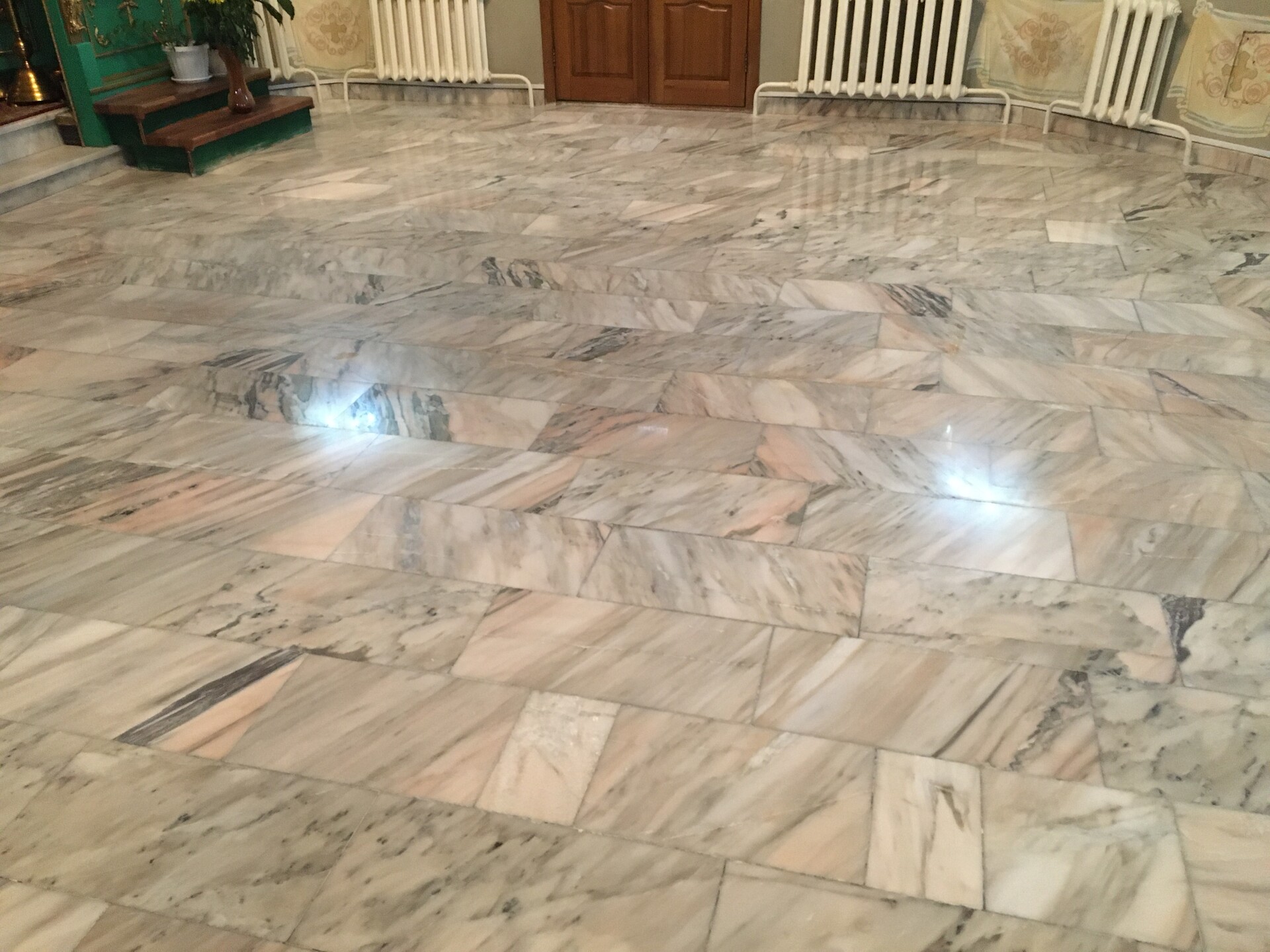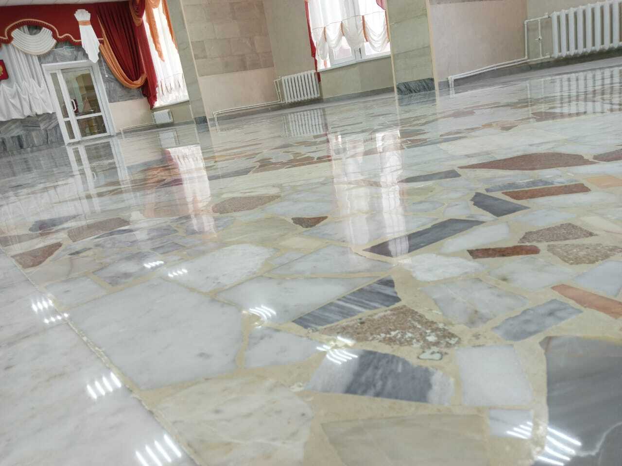 Полировка –обработка полов абразивными кругами. В процессе полировки удаляются даже микроскопические царапины, пол становится абсолютно гладким. Специализированные компании для полировки применяют роторные машины (те же, что и для шлифовки).Единственное, что полировка – процесс более деликатный. Полируют каменный пол, смачивая поверхность водой. Иногда выполняют обработку на сухую, но она считается менее качественной. Водонасыщение камня делает его более податливым, полировка выполняется легче. Полировку выполняют медленно, передвигаясь от одной части пола к другой. Стараются убрать (или сделать менее глубокими)все видимые царапины. После полировки мрамор начинает отражать окружающие предметы. В конце выполняют финишную полировку – с помощью доводочных порошков и паст.