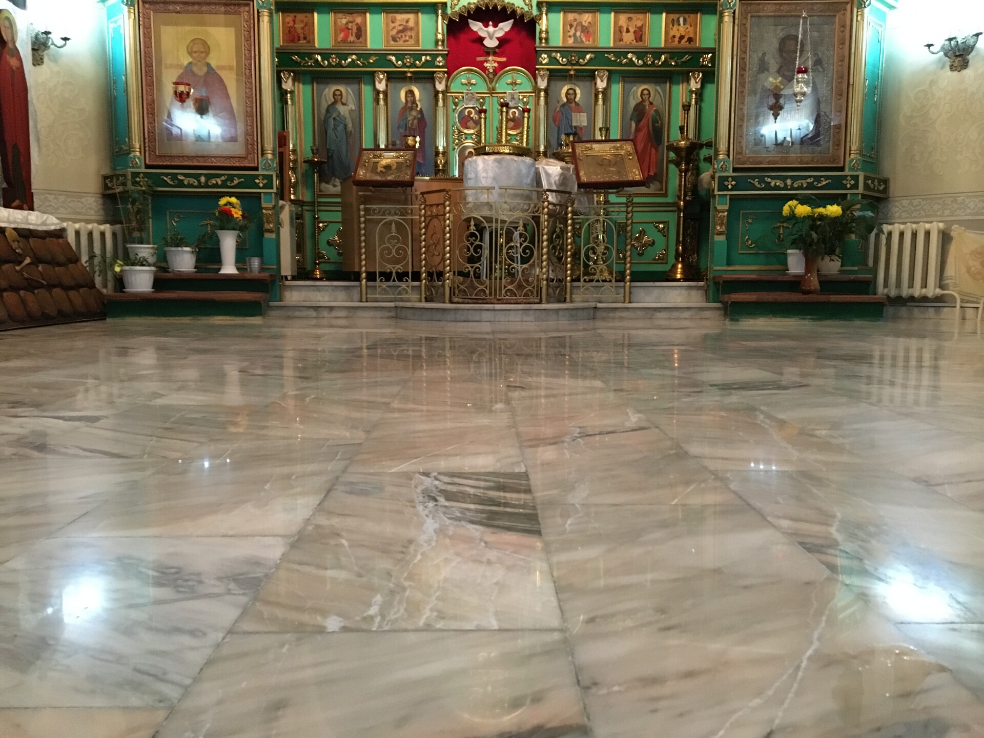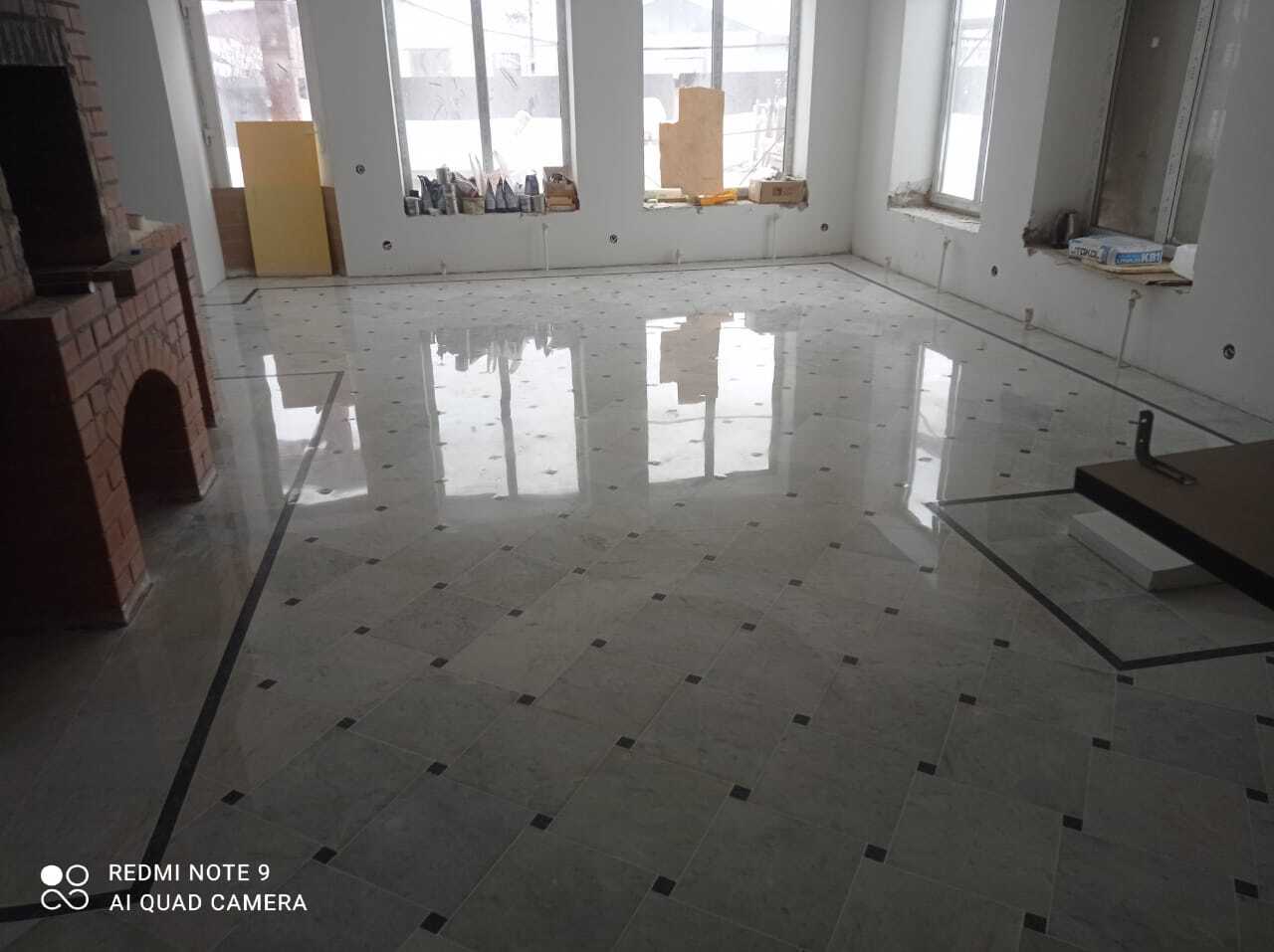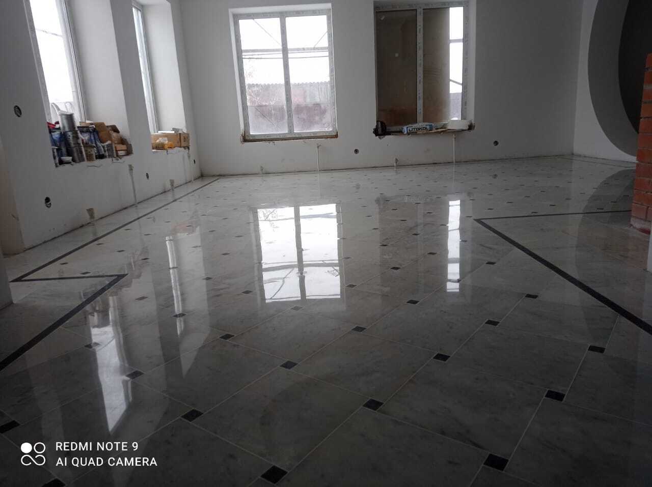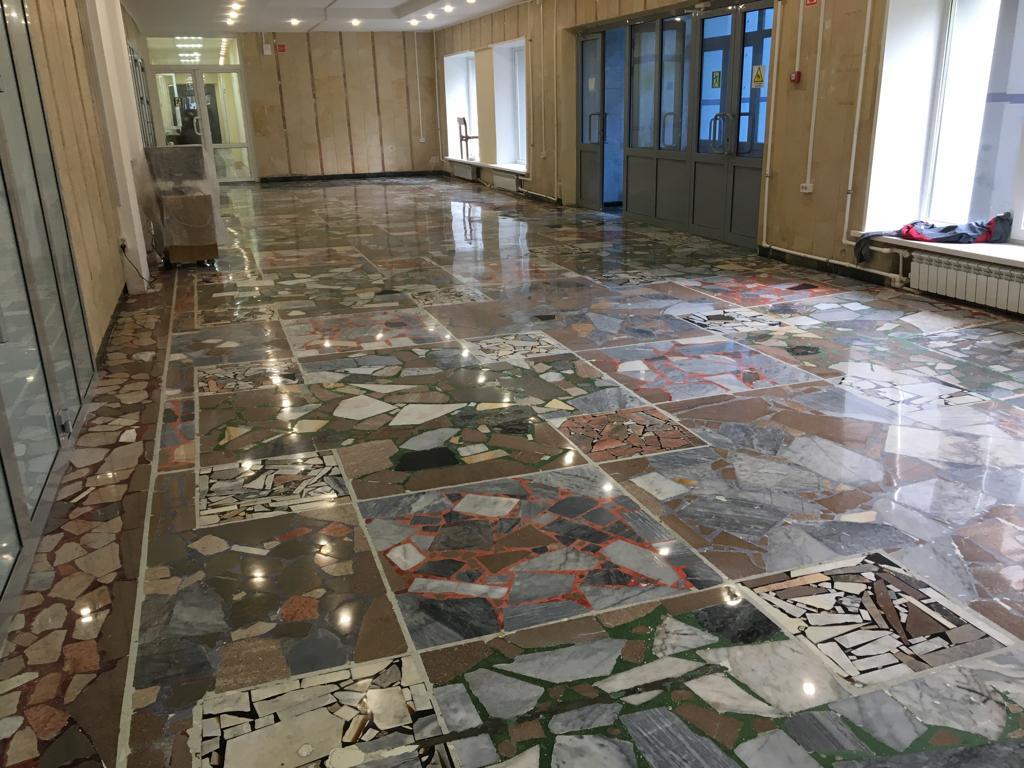 Полировка –обработка полов абразивными кругами. В процессе полировки удаляются даже микроскопические царапины, пол становится абсолютно гладким. Специализированные компании для полировки применяют роторные машины (те же, что и для шлифовки).Единственное, что полировка – процесс более деликатный. Полируют каменный пол, смачивая поверхность водой. Иногда выполняют обработку на сухую, но она считается менее качественной. Водонасыщение камня делает его более податливым, полировка выполняется легче. Полировку выполняют медленно, передвигаясь от одной части пола к другой. Стараются убрать (или сделать менее глубокими)все видимые царапины. После полировки мрамор начинает отражать окружающие предметы. В конце выполняют финишную полировку – с помощью доводочных порошков и паст.