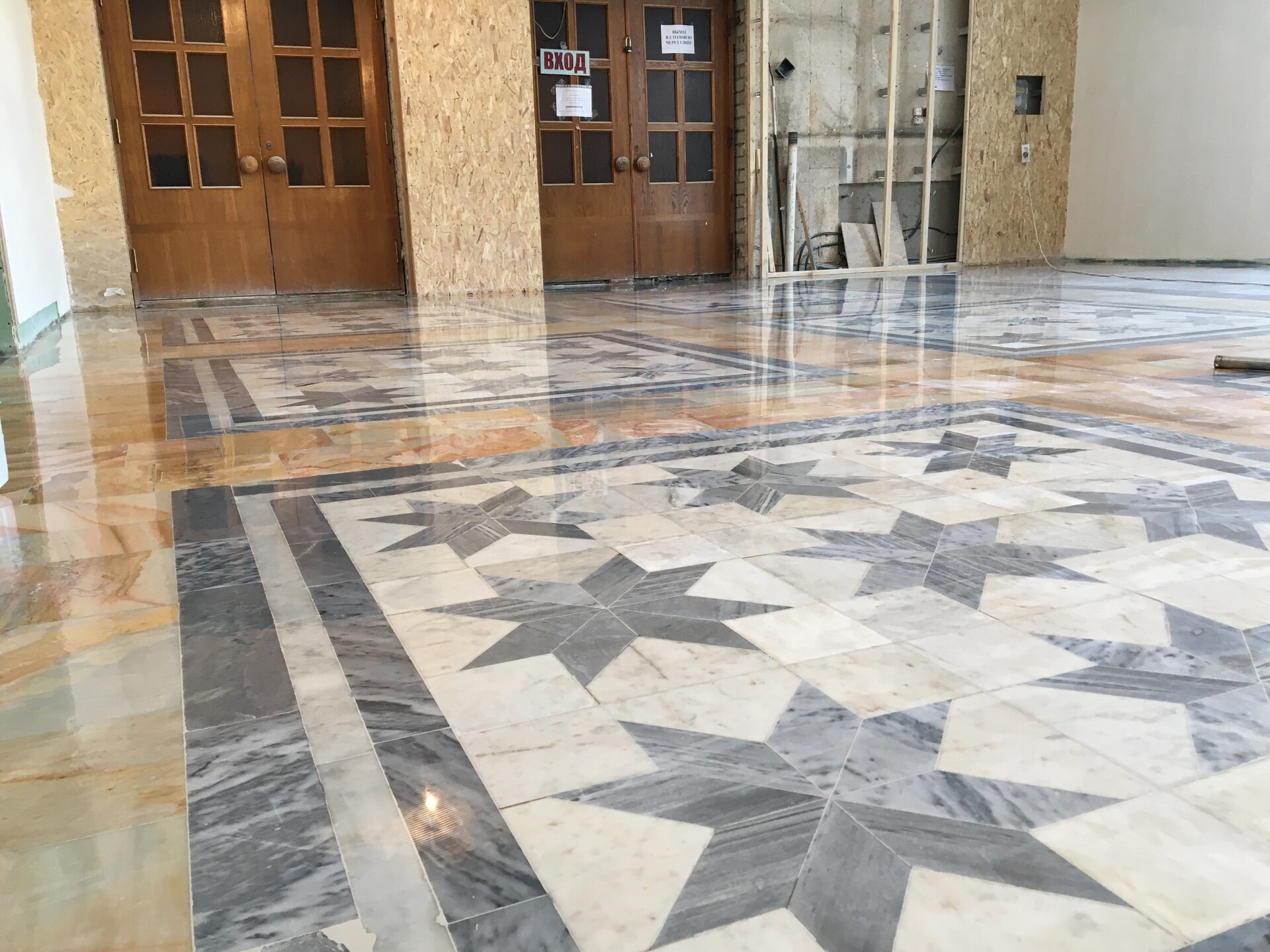 Полы из натурального мрамора или гранита, как и любые другие, со временем теряют привлекательность, приобретают следы износа. Пропадает лакированный блеск, появляются множественные царапины, сколы и неровности со временем увеличиваются в размерах. Однако такие повреждения – не повод менять дорогостоящее покрытие. Каменным полам можно вернуть былой лоск с помощью комплекса реставрационных работ, в состав которых входит шлифовка и полировка покрытия. Мероприятия по возвращению каменной поверхности блеска: шлифовка; непосредственная полировка; финишная полировка; импрегнация. Стоит заметить, что гранит и мрамор – камни с разными характеристиками. Мрамор – мягкий, пористый материал, легко поддающийся обработке абразивами. Гранит – намного более твердый, требующий длительной и трудоемкой полировки. Поэтому в процессах реставрации поверхностей из мрамора и гранита есть небольшие различия. В любом случае, все эти работы можно поручить специализированным кампаниям, в арсенале которых есть специализированные механизмы и опытные работники.