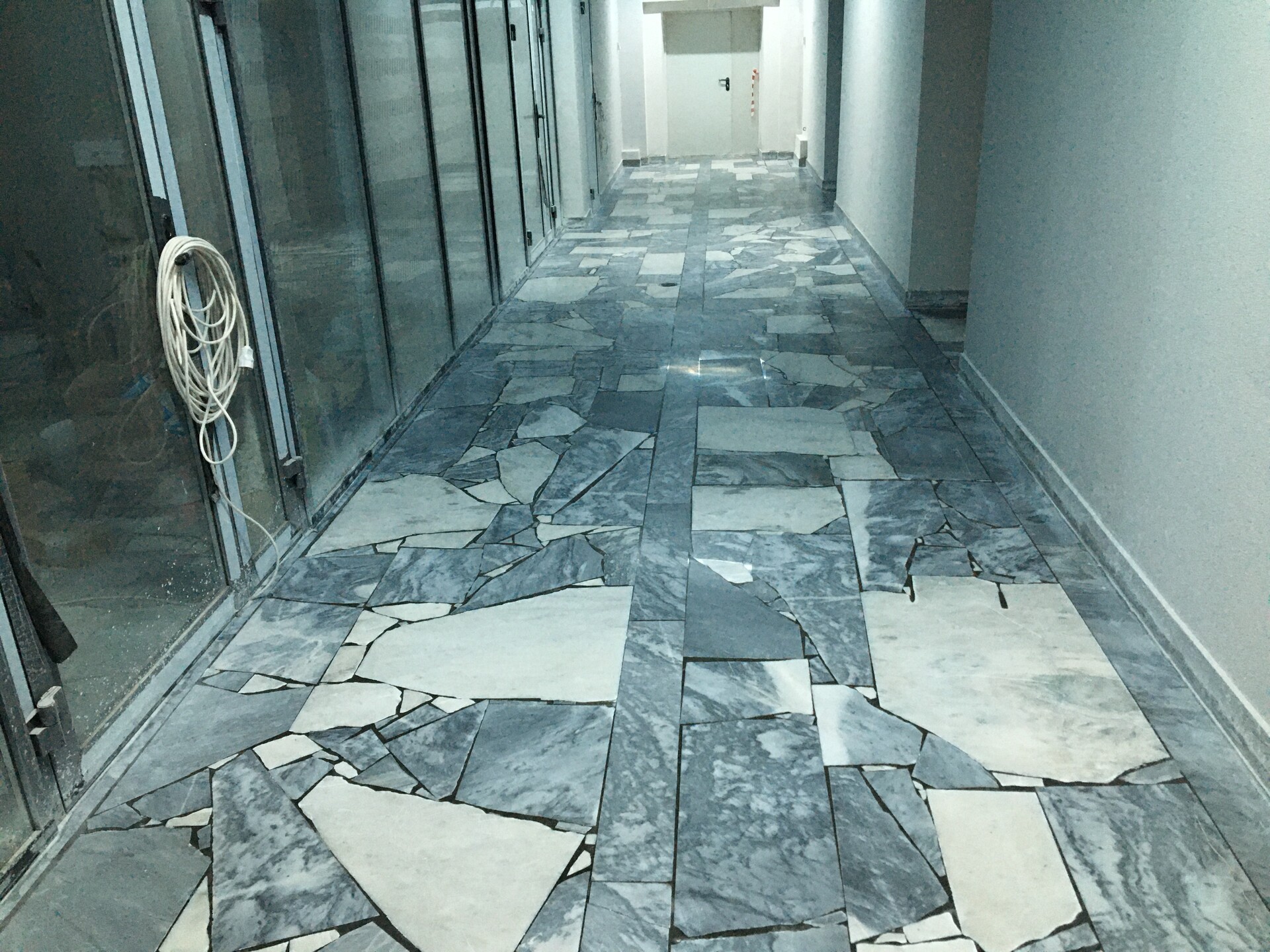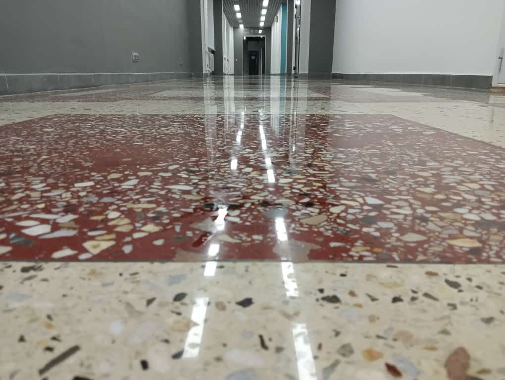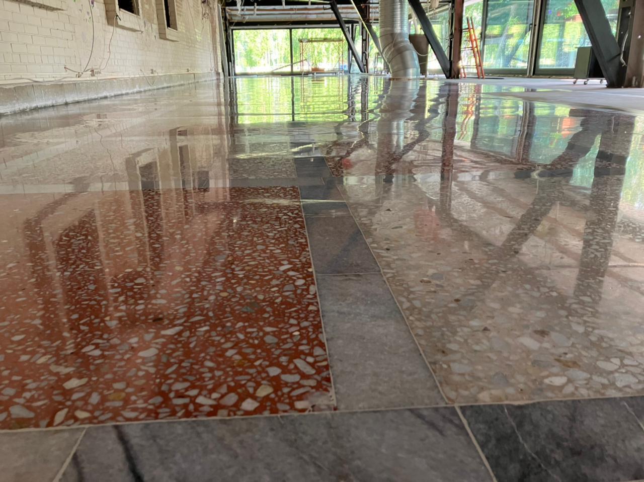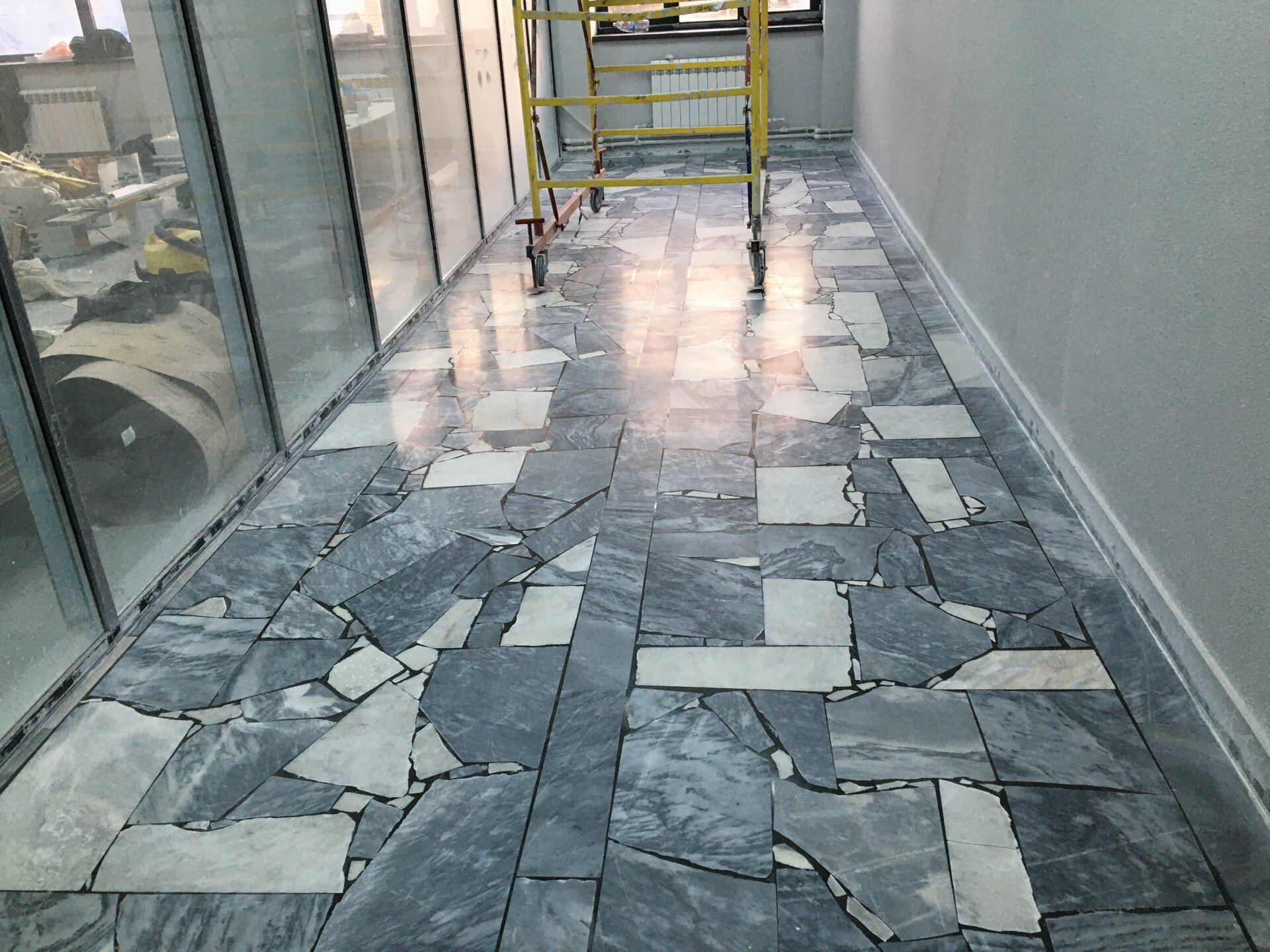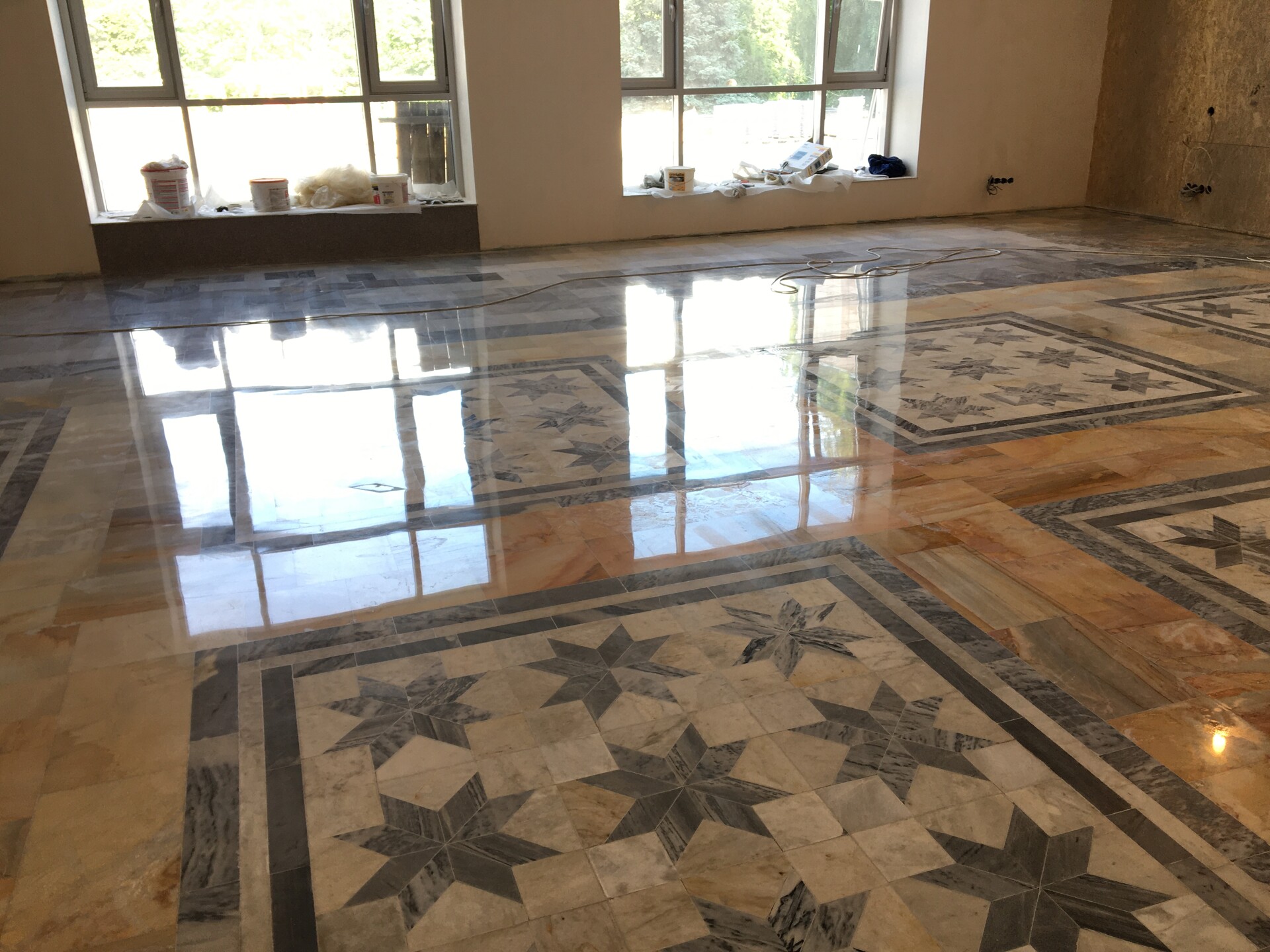 Для финишной полировки используют специальные полироли (пасты, порошки). Наносят их часто вручную, втирая в поверхность пола фетром, войлоком, хлопчатобумажной или шерстяной тканью. Чтобы повысить долговечность каменного пола и, при необходимости, усилить блеск применяют защитные средства на основе воска, парафина или силикона. Кроме дополнительного эффекта «лаковой» поверхности, эти вещества покрывают камень микроскопической плёнкой, защищающей поверхность отводы, жира, различных жидкостей, пыли. Импрегнация – необязательный этап, выполняется при желании. Блестящая поверхность выглядит презентабельно, эффектно. Полированный пол – это красиво, благородно, статусное и эстетически безупречно.